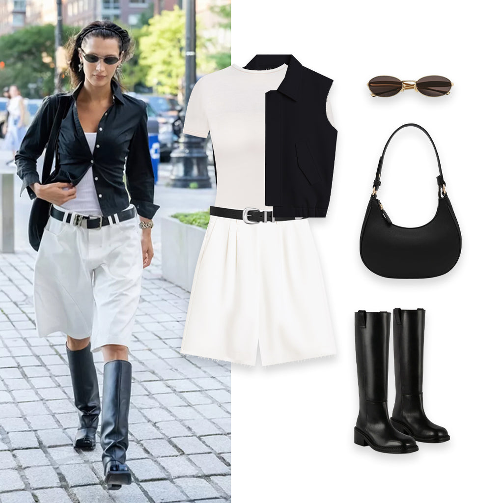 Bella Hadid revived Bermuda shorts — with a white tee and black accents, she makes it look A+.
