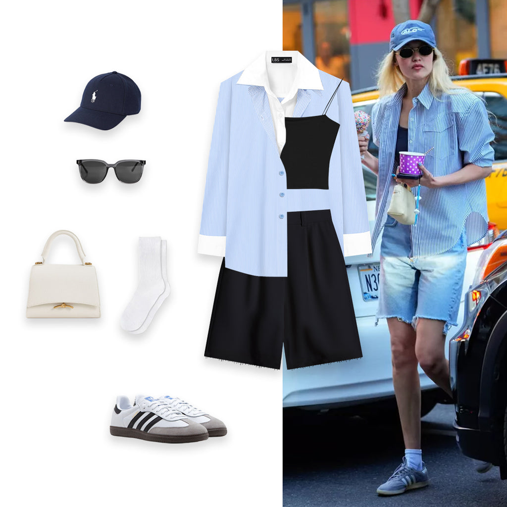 Gigi makes Bermuda shorts effortless, with a black tank, striped shirt, and cap — cute and easy for weekends.