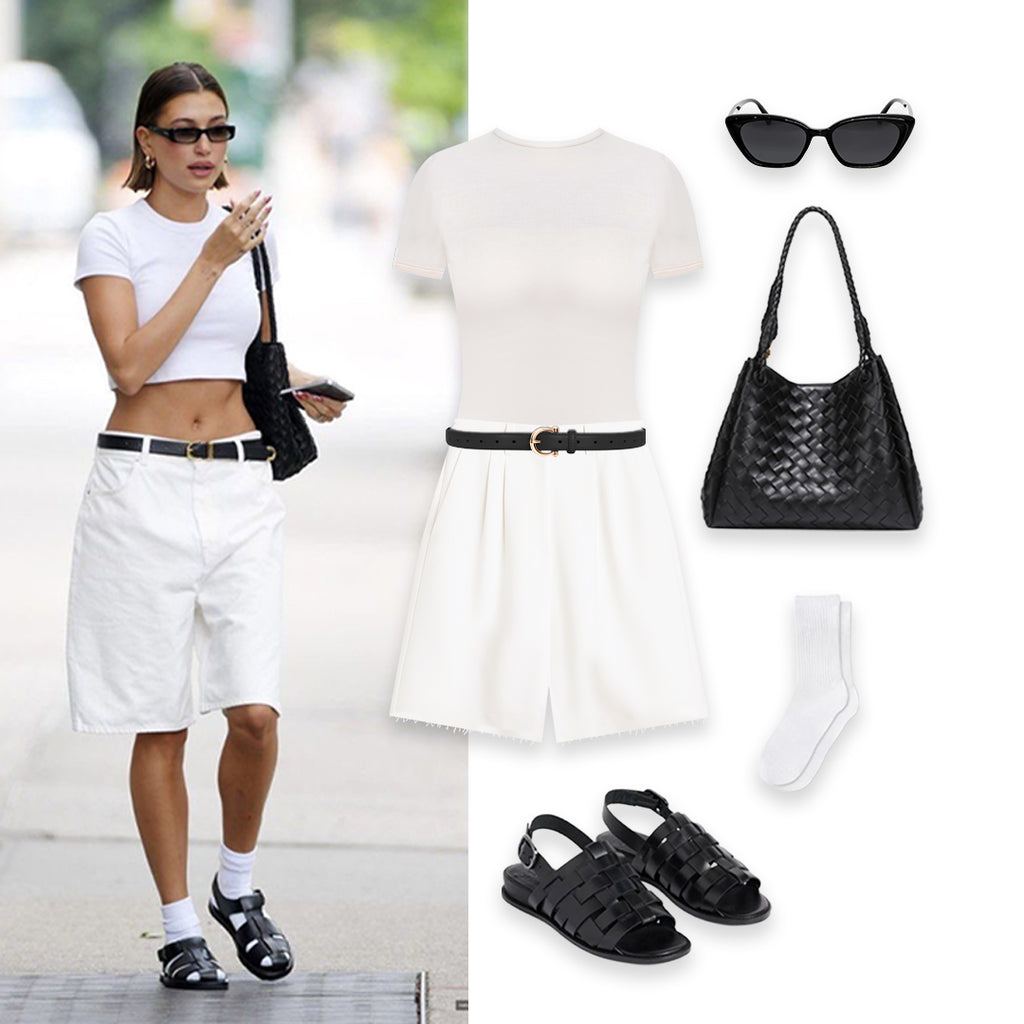 Hailey Bieber nails casual-cool in a white crop top, Bermuda shorts, black belt, shades, and sandals with socks.