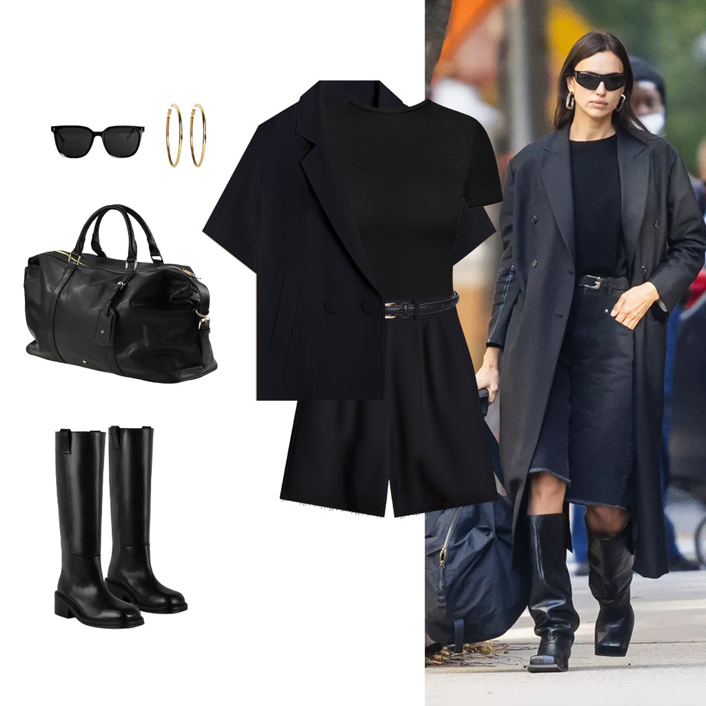 Irina Shayk nails monochrome street style in a black coat as an outer layer, a crop tee underneath, Bermuda shorts, and knee-high boots — effortlessly chic with sunglasses and a tote.