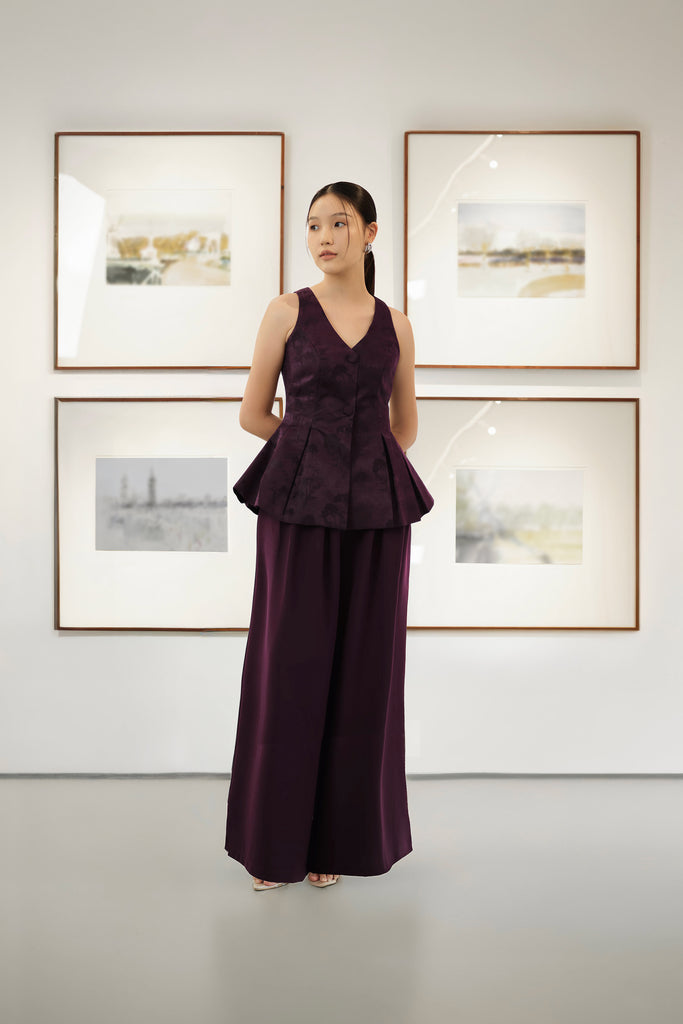 The Trave Top is a refined sleeveless piece that highlights femininity with its peplum waist and delicate jacquard texture. Designed with a flattering V-neckline and adorned with a geranium floral motif, it blends elegance and modern charm—perfect for both day and evening occasions.